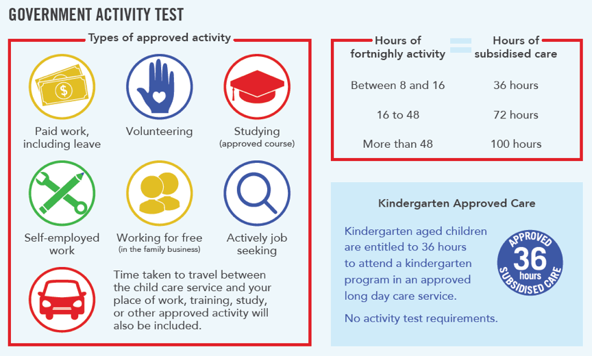 The subsidy you receive and any applicable cap will depend upon your own personal circumstances and is subject to your combined family income, hours of recognised activity and child care details. For more information visit The Department of Education’s website at education.gov.au/childcare.